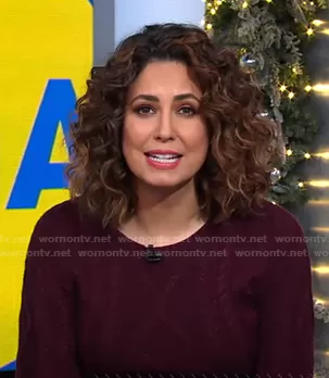Cecilia Vega on Good Morning America on ABC was spotted wearing this burgundy cable knit sweater and skirt on Good Morning America on Dec 21 2020's episode. Cecilia's Sweater is the Cable-Knit Sweater - 7th Avenue by New York & Company . Cecilia's Skirt is the Cable-Knit Sweater Skirt - 7th Avenue by New York & Company.