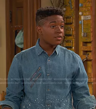 Booker Baxter (played by Issac Ryan Brown) on Ravens Home on Disney was spotted wearing this paint splatter chambray shirt on Ravens Home on episode 'Mad About Yuletide' (4x07) in Dec 2020. Booker's Shirt is the Paint Splatter Denim Shirt by INC International Concepts.