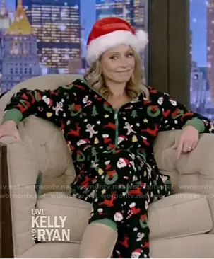 Kelly Ripa on Live with Kelly and Mark on Disney ABC Home Entertainment was spotted wearing this cristmas onesie on Live with Kelly and Ryan on Dec 22 2020's episode. Kelly's Pajamas is the Holiday Cookie Cutter Adult Jumpsuit by Tipsy Elves.