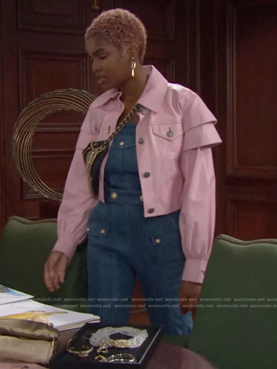 Paris Buckingham (played by Diamond White) on The Bold and the Beautiful on CBS was spotted wearing this pink leather jacket on The Bold and the Beautiful on Dec 16 2020's episode. Paris's Jacket is the Vintage Light Pink Leather Jacket by Chanel . Paris's Bag is the Lambskin Quilted All About Chains Waist Belt Bag Black by Chanel.
