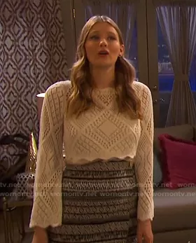 Alice Caroline Horton (played by Lindsay Arnold) on Days of our Lives on Peacock was spotted wearing this white eyelet top and embroidered skirt on Days of our Lives on Dec 26 2020's episode. Allie's Skirt is the Renna Button-Wrap Mini Skirt by Alice + Olivia.