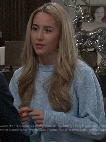 Josslyn Jacks (played by Eden McCoy) on General Hospital on ABC was spotted wearing this blue marled sweater on General Hospital on Dec 27 2020's episode. Josslyn's Sweater is the Jodie Sweater by Line & Dot.
