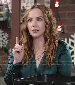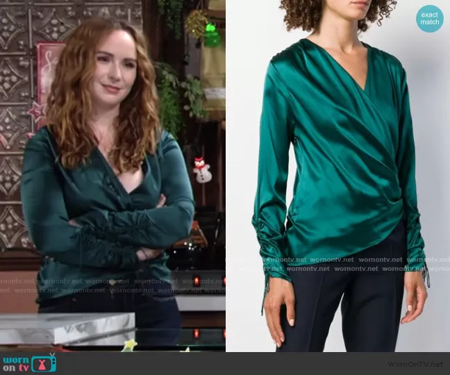 Mariah Copeland (played by Camryn Grimes) on The Young and the Restless on CBS was spotted wearing this green satin wrap top on The Young and the Restless on Dec 28 2020's episode. Mariah's Top is the Wrap Silk Blouse by Jonathan Simkhai.