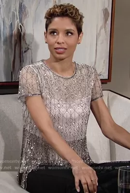 Elena Dawson (played by Brytni Sarpy) on The Young and the Restless on CBS was spotted wearing this embellished fringe top on The Young and the Restless on Dec 29 2020's episode. Elena's Top is the Joselyn Beaded Fringe Blouse by Elie Tahari.