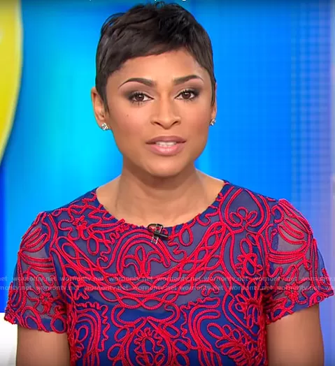 Jericka Duncan on CBS Mornings on CBS was spotted wearing this blue and red embroidered dress on CBS This Morning on Dec 29 2020's episode. Jericka's Dress is the Soutache Chiffon Cocktail Dress by JS Collections .