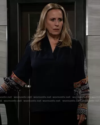 Laura Collins (played by Genie Francis) on General Hospital on ABC was spotted wearing this blue embroidered wrap blouse on General Hospital on Jan 06 2021's episode. Laura's Top is the Keely Embroidered Silk Blouse by Kobi Halperin.