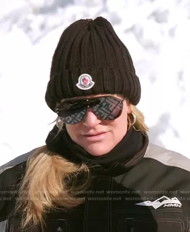 Heather Gay on The Real Housewives of Salt Lake City on Bravo was spotted wearing this black beanie and Fendi sunglasses on The Real Housewives of Salt Lake City on episode 'Hot Tub Confessions' (1x08) in Jan 2021. Heather's Hat is the Ribbed Beanie by Moncler . Heather's Sunglasses is the Fabulous Printed Aviator Sunglasses by Fendi.