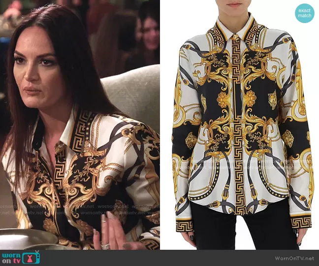 Lisa Barlow on The Real Housewives of Salt Lake City on Bravo was spotted wearing this printed blouse on The Real Housewives of Salt Lake City on episode 'Hot Tub Confessions' (1x08) in Jan 2021. Lisa's Top is the Silk Shirt by Versace.