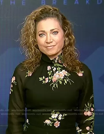 Ginger Zee on Good Morning America on ABC was spotted wearing this black floral print mock neck dress on Good Morning America on Jan 13 2023's episode. Ginger's Dress is the Valentin Dress by Reformation.