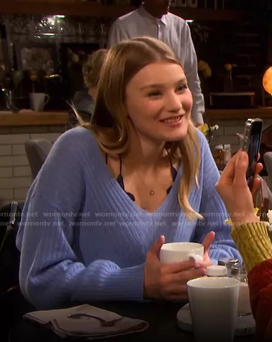 Alice Caroline Horton (played by Lindsay Arnold) on Days of our Lives on Peacock was spotted wearing this blue v-neck sweater on Days of our Lives on Jan 05 2021's episode. Allie's Sweater is the Elias Cashmere V Sweater by Free People . Allie's Bra is the Adella Longline Bralette by Free People.