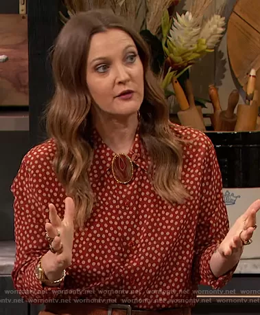 Drew Barrymore on The Drew Barrymore Show on CBS was spotted wearing this red polka dot blouse and pants on The Drew Barrymore Show on Jan 05 2021's episode. Drew's Top is the Polka-dot silk crepe de chine shirt by Saint Laurent . Drew's Pants is the Alexa virgin wool pleated trousers by The Row.