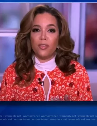 Sunny Hostin on The View on ABC was spotted wearing this red floral keyhole blouse on The View on Jan 05 2021's episode. Sunny's Top is the Crepe Flower Print Keyhole Top by Chloe.