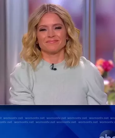 Sara Haines on The View on ABC was spotted wearing this mint puff sleeve sweater on The View on Jan 05 2021's episode. Sara's Sweater is the Drea Loungewear Knit Drape-Sleeve Sweater by Jonathan Simkhai.