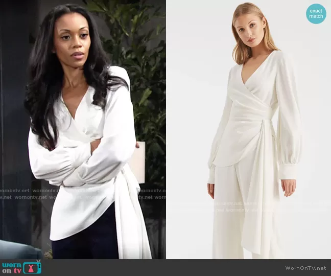 Amanda Sinclair (played by Mishael Morgan) on The Young and the Restless on CBS was spotted wearing this white wrap blouse on The Young and the Restless on Jan 05 2021's episode. Amanda's Top is the Alanna Blouse by Sachin + Babi.