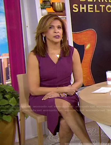 Hoda Kotb on Today on NBC was spotted wearing this purple belted sleeveless dress on Today on Feb 10 2021's episode. Hoda's Dress is the Dadorina Belted Front Slit Sheath Dress by Boss.