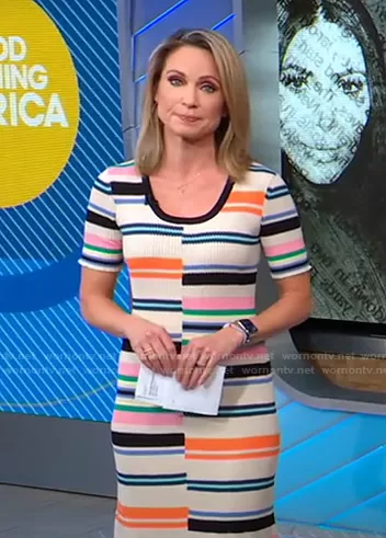 Amy Robach on Good Morning America on ABC was spotted wearing this striped ribbed knit dress on Good Morning America on Jan 06 2021's episode. Amy's Dress is the Striped Bodycon Maxi Dress by Kenzo . Amy's Necklace is the Rising Star Necklace by Accessory Concierge.
