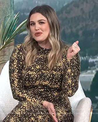Carissa Loethen Culiner on E! News on E! was spotted wearing this yellow printed ruched dress on E! News Daily Pop on Jan 07 2021's episode. Carissa's Dress is the Animal Print Ruched Long Sleeve Jersey Midi Dress by Topshop.