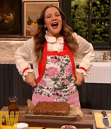 Drew Barrymore on The Drew Barrymore Show on CBS was spotted wearing this floral apron on The Drew Barrymore Show on Jan 07 2021's episode. Drew's Apron is the Vintage Floral Apron by Drew Barrymore Flower Home.
