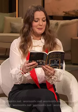 Drew Barrymore on The Drew Barrymore Show on CBS was spotted wearing this white ruffle blouse with scarf on The Drew Barrymore Show on Jan 07 2021's episode. Drew's Top is the Frill Collar Shirt by Victoria Beckham . Drew's Pants is the Side Stripe Pintucked Stretch Wool Flare Pants by Chloe.