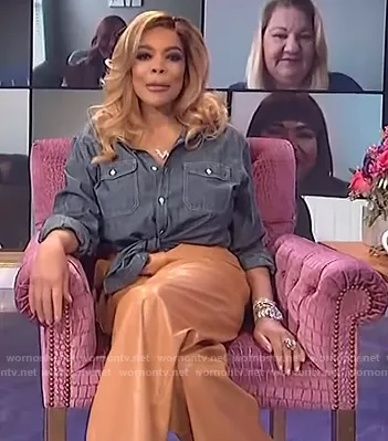 Wendy Williams on The Wendy Williams Show on Various was spotted wearing this beige leather pants on The Wendy Williams Show on Jan 07 2021's episode. Wendy's Pants is the Camel Croc Faux Leather Wide Leg Pants by Pretty Little Thing.