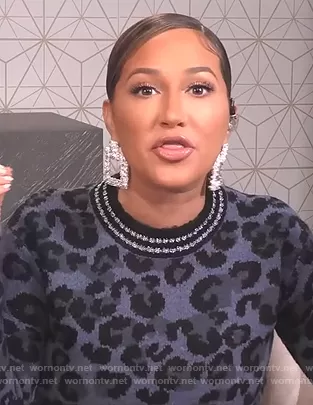 Adrienne Houghton on The Real on BETher was spotted wearing this blue leopard sweater on The Real on Jan 08 2021's episode. Adrienne's Sweater is the Leopard-Print Sweater Central Park West.