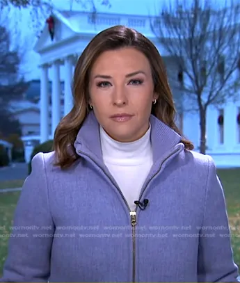 Mary Bruce on Good Morning America on ABC was spotted wearing this lilac zip front coat on Good Morning America on Dec 08 2025's episode. Mary's Coat is the Lodge Coat by J. Crew.