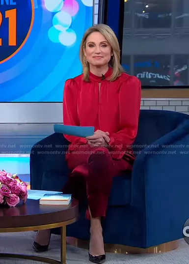 Amy Robach on Good Morning America on ABC was spotted wearing this red keyhole blouse and velvet pants on Good Morning America on Jan 11 2021's episode. Amy's Top is the Angela Keyhole Long Sleeve Top by Ramy Brook . Amy's Pants is the Velvet Pants by Ramy Brook.