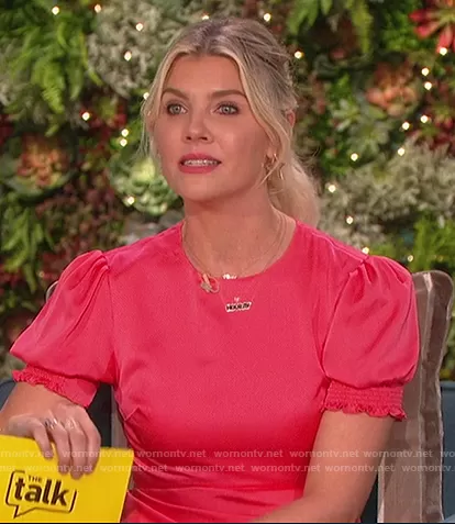 Amanda Kloots on The Talk on CBS was spotted wearing this pink smocked sleeve dress on The Talk on Jan 11 2021's episode. Amanda's Dress is the Blaer Bias Midi Dress by Ted Baker.