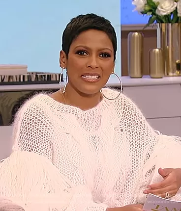 Tamron Hall on Tamron Hall Show on ABC was spotted wearing this white crochet feather trim sweater on Tamron Hall Show on Jan 11 2021's episode. Tamron's Sweater is the Feather-trimmed cable-knit mohair-blend sweater by Loewe.