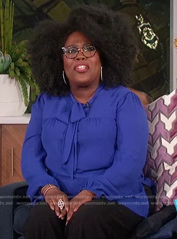 Sheryl Underwood on The Talk on CBS was spotted wearing this blue tie neck blouse on The Talk on Jan 12 2021's episode. Sheryl's Top is the Long Puff Sleeve Tie Neck Blouse by DKNY.