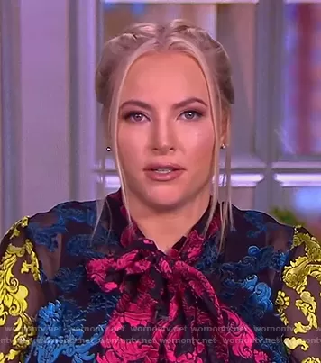 Meghan McCain on The View on ABC was spotted wearing this printed tie neck blouse on The View on Jan 13 2021's episode. Meghan's Top is the Jeannie pussy-bow collar blouse by Alice + Olivia.