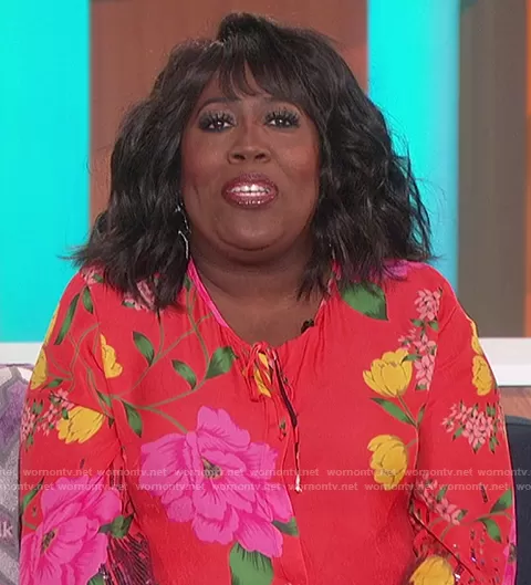 Sheryl Underwood on The Talk on CBS was spotted wearing this red floral blouse on The Talk on Jan 13 2021's episode. Sheryl's Top is the Noelle Floral Print Blouse by Kobi Halperin.
