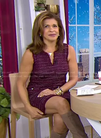 Hoda Kotb on Today on NBC was spotted wearing this burgundy tweed dress on Today on Jan 18 2021's episode. Hoda's Dress is the Sleeveless Tweed Dress by Karl Lagerfeld .