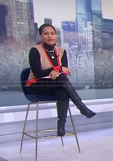 Sheinelle Jones on Today on NBC was spotted wearing this beige colorblock cardigan on Today on Feb 17 2021's episode. Sheinelle's Sweater is the Colorblock Madeline Cardigan by Tory Burch.
