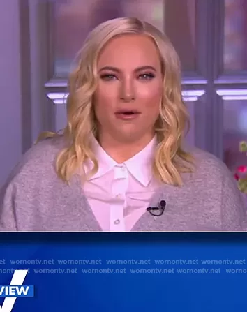 Meghan McCain on The View on ABC was spotted wearing this gray layered v-neck sweater on The View on Jan 14 2021's episode. Meghan's Sweater is the Brami Mixed Media Layered Look Wool & Cashmere Sweater by Veronica Beard.