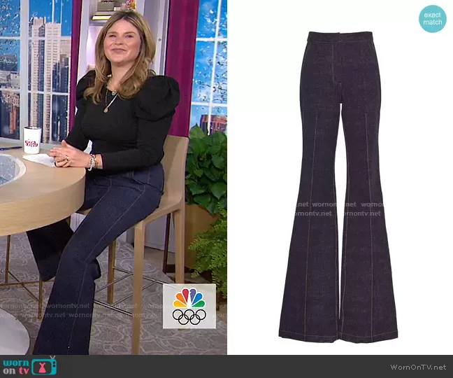 Jenna Bush Hager on Today on NBC was spotted wearing this puff sleeve top and flare jeans on Today on Jan 14 2021's episode. Jenna's Pants is the Stretch Denim Ruthie Pant by Pearl by Lela Rose.