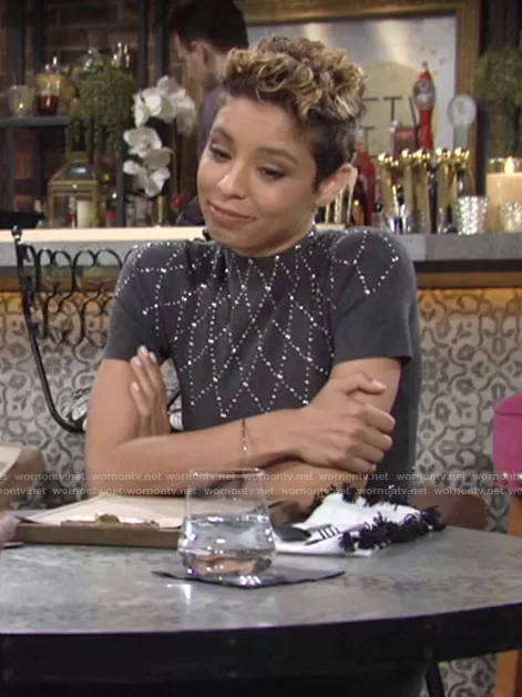 Elena Dawson (played by Brytni Sarpy) on The Young and the Restless on CBS was spotted wearing this grey studded dress on The Young and the Restless on Jan 14 2021's episode. Elena's Dress is the Short stud-embellished dress by Sandro.