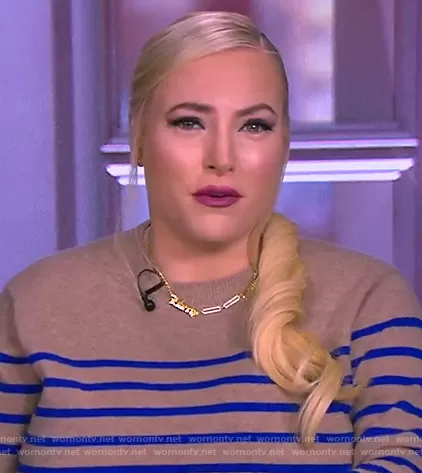 Meghan McCain on The View on ABC was spotted wearing this striped cashmere sweater on The View on Jan 15 2021's episode. Meghan's Sweater is the AAA Lean Lines striped cashmere sweater by La Ligne.