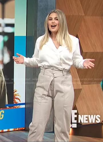 Carissa Loethen Culiner on E! News on E! was spotted wearing this white blouse and leather belted pants on E! News Daily Pop on Jan 15 2021's episode. Carissa's Pants is the Leela Faux-Leather Trousers by Jonathan Simkhai.