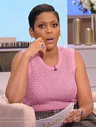 Tamron Hall on Tamron Hall Show on ABC was spotted wearing this pink metallic knit top and pleated skirt on Tamron Hall Show on Jan 15 2021's episode. Tamron's Top is the Metallic knitted tank by Dolce & Gabbana . Tamron's Skirt is the Glitter tulle tiered pleated skirt by Christopher Kane.