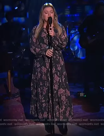 Kelly Clarkson on The Kelly Clarkson Show on NBC was spotted wearing this floral print midi dress on The Kelly Clarkson Show on Jan 18 2021's episode. Kelly's Dress is the Feeling Groovy Long Sleeve Midi Dress by Free People.