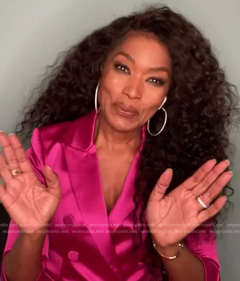 on The Talk on CBS was spotted wearing this pink satin blazer on The Talk on Jan 18 2021's episode. 's Blazer is the Empire Dickey satin blazer by Veronica Beard.