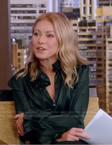 Kelly Ripa on Live with Kelly and Mark on Disney ABC Home Entertainment was spotted wearing this green striped blouse on Live with Kelly and Ryan on Jan 19 2021's episode. Kelly's Top is the Ruffled striped silk-satin blouse by Saint Laurent.