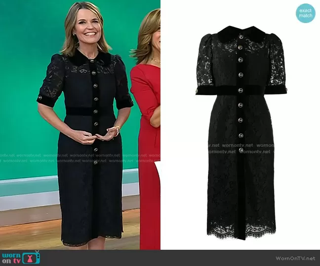 Savannah Guthrie on Today on NBC was spotted wearing this black lace buttoned front dress on Today on Apr 15 2024's episode. Savannah's Dress is the Collared Lace Midi Dress by Dolce & Gabbana . Savannah's Shoes is the Cutout Platform Heeled Sandals by Gucci.