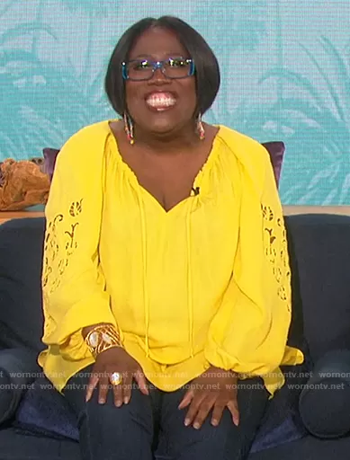Sheryl Underwood on The Talk on CBS was spotted wearing this yellow eyelet top on The Talk on Jul 28 2021's episode. Sheryl's Top is the Paulina Cutout Silk Blouse by Kobi Halperin.