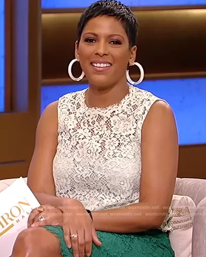 Tamron Hall on Tamron Hall Show on ABC was spotted wearing this white lace top and skirt on Tamron Hall Show on Jan 21 2021's episode. Tamron's Top is the Lace Sleeveless Blouse by Dolce and Gabbana . Tamron's Skirt is the Lace Midi Skirt by Dolce and Gabbana.