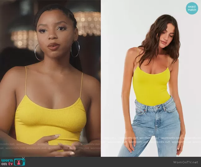 Jazlyn Forster (played by Chloe Bailey) on Grown-ish on Freeform was spotted wearing this yellow ribbed bodysuit on Grown-ish on episode 'Public Service Announcement' (3x09) in Jan 2021. Jazlyn's Bodysuit is the Seamless Ribbed Bungee Bodysuit by Out From Under.