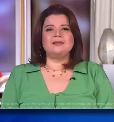 Ana Navarro on The View on ABC was spotted wearing this green v-neck blouse with collar on The View on Jan 22 2021's episode. Ana's Top is the Tie Front Blouse with Collar by Eloquii.