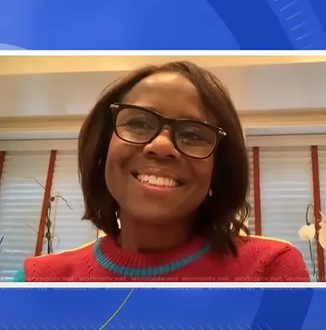 Deborah Roberts on Good Morning America on ABC was spotted wearing this colorblock sweater on Good Morning America on Jan 22 2021's episode. Deborah's Sweater is the Colorblocked Wool-Blend Crewneck Sweater by Victoria Beckham.