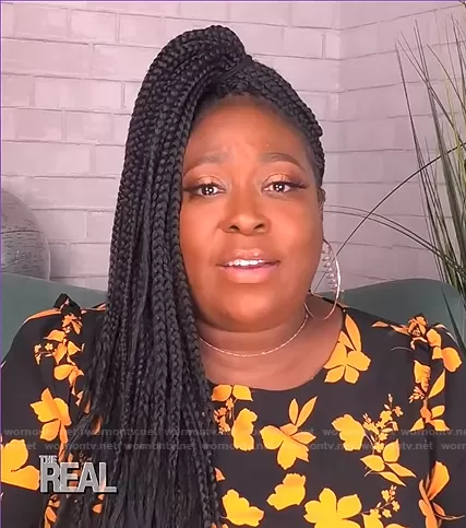 Loni Love on The Real on BETher was spotted wearing this black and yellow floral dress on The Real on Jan 22 2021's episode. Loni's Dress is the Floral Ruffle Long Sleeve Crepe Shift Dress by Eloquii.